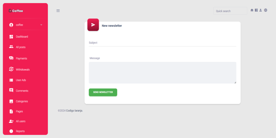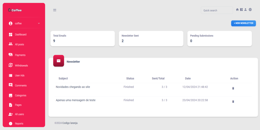 Addon de newsletter para administração, você pode facilmente enviar newsletters informativas, atualizações importantes e notícias emocionantes para todos os usuários cadastrados em sua plataforma. Este recurso é essencial para manter sua comunidade informada, engajada e conectada com as últimas novidades e informações relevantes.